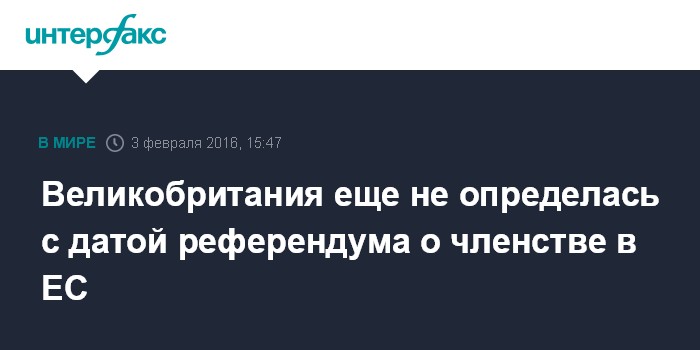 Москва. 3 февраля. INTERFAX.RU - Премьер-министр Великобритании Дэвид Кэмерон заявил в среду, что пока не определил дату проведения референдума по вопросу о членстве страны в ЕС, сообщает телеканал Sky News.