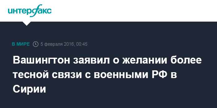 Москва. 5 февраля. INTERFAX.RU - В Вашингтоне рассчитывают на более тесную связь с российскими военными в Сирии, сообщил на брифинге в четверг представитель госдепа США Джон Кирби.