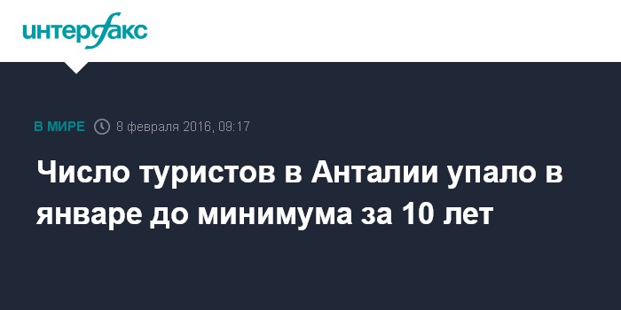 Москва. 8 февраля. INTERFAX.RU - Число иностранных туристов, посетивших в январе турецкий курорт Анталия, составило всего 97 601 человек, что является самым низким за последние 10 лет показателем, сообщает агентство Bloomberg со ссылкой данные, опубликованные газетой Hurriyet.