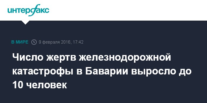 Москва. 9 февраля. INTERFAX.RU - По меньшей мере 10 человек погибли во вторник в результате лобового столкновения двух пассажирских поездов близ населенного пункта Бад-Айблинг (федеральная земля Бавария) в германии, сообщают местные СМИ со ссылкой на полицию.