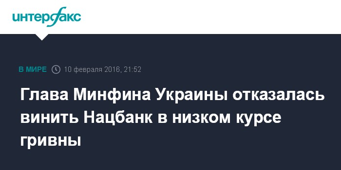 Москва. 10 февраля. INTERFAX.RU - Динамика курса гривны определяется влиянием большого числа факторов, в том числе решениями всех ветвей власти, поэтому возлагать ответственность за его (курса) падение только на Национальный банк Украины или правительство неправильно, заявила министр финансов Наталия Яресько.