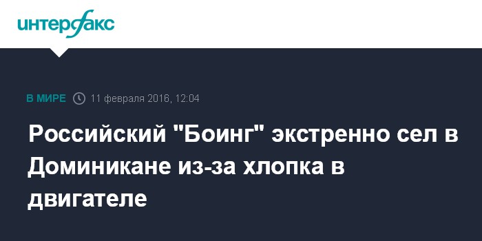 Москва. 11 февраля. INTERFAX.RU - Причиной нештатной ситуации с самолетом Boeing-777-200 "Оренбургских авиалиний" (Orenair, входит в группу "Аэрофлот") в городе Пунта-Кана (Доминиканская республика) стал хлопок в двигателе, сообщает авиакомпания.