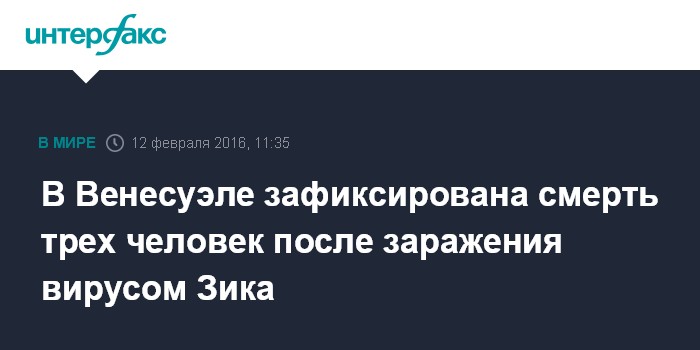 Москва. 12 февраля. INTERFAX.RU - Три человека, зараженные вирусом Зика, скончались в Венесуэле из-за осложнений, вызванных этим заболеванием, сообщил в пятницу президент Венесуэлы Николас Мадуро в эфире национального телевидения.