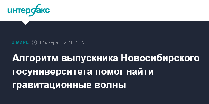 Москва. 12 февраля. INTERFAX.RU - Алгоритм, позволивший впервые в мире зарегистрировать гравитационные волны, разработал выпускник Новосибирского госуниверситета и экс-сотрудник Института ядерной физики имени Будкера Сергей Клименко, сообщает пресс-служба НГУ.