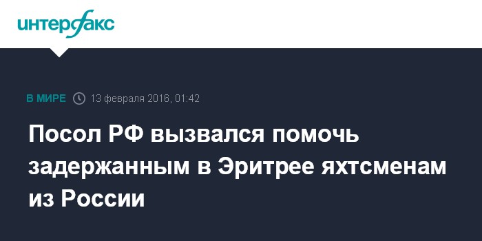 Москва. 13 февраля. INTERFAX.RU - Посольство России в Эритрее сообщило, что работает над освобождением задержанного властями страны экипажа российской яхты. Как пишет "Коммерсантъ" 13 февраля, сами моряки утверждают, что оказались на территории случайно, пристав к берегу во время шторма.