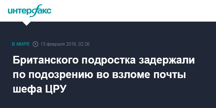 Москва. 13 февраля. INTERFAX.RU - Подростка из Великобритании подозревают во взломе личной электронной почты главы ЦРУ Джона Бреннана и публикации в интернете его персональных данных. Как пишет The Telegraph, 16-летнего юношу задержали в четверг в рамках расследования дела о кибератаках на Бреннана.