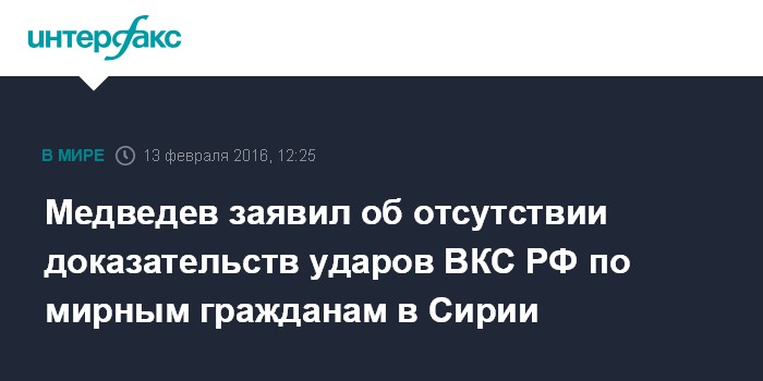 Москва. 13 февраля. INTERFAX.RU - Никаких доказательств того, что российские ВКС в Сирии наносят удары по мирному населению, никто не предоставил, заявил премьер РФ Дмитрий Медведев.