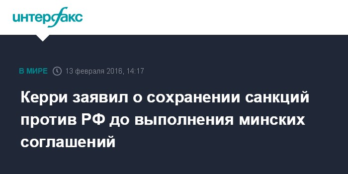 Москва. 13 февраля. INTERFAX.RU - США и Евросоюз не снимут санкции с России до полного выполнения минских договоренностей, заявил американский госсекретарь Джон Керри.