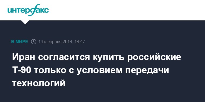 Москва. 14 февраля. INTERFAX.RU - Иран не отказался от планов приобрести у России танки Т-90, заявил в воскресенье заместитель командующего сухопутными войсками Исламской республики генерал Киомарс Хейдари. Но условием сделки должна, по его словам, быть передача технологий производства.