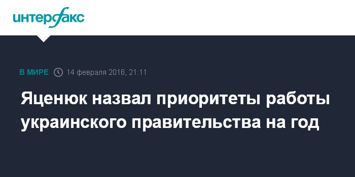 Москва. 14 февраля. INTERFAX.RU - В повестке дня правительства Украины на 2016 год - проведение широкомасштабной реформы Государственной фискальной службы и таможни, прозрачная приватизация, завершение налоговой реформы и продолжение процесса дерегуляции, сообщил в воскресенье премьер-министр Украины Арсений Яценюк.