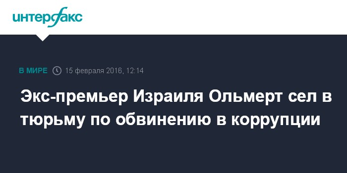 Москва. 15 февраля. INTERFAX.RU - Бывший премьер-министр Израиля Эхуд Ольмерт сел в тюрьму в городе Рамле по обвинению во взяточничестве, сообщили в понедельник местные СМИ.