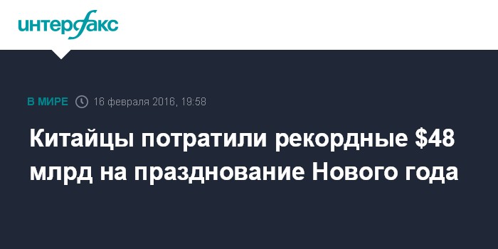 Москва. 16 февраля. INTERFAX.RU - Потребители Китая увеличил расходы на путешествия и развлечения в ходе недельных празднований Нового года по лунному календарю, потратив в общей сложности 312 млрд юаней ($48 млрд) и установив тем самым новый рекорд, свидетельствуют подсчеты оператора платежной системы China UnionPay Co.