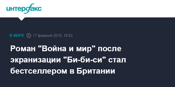 Москва. 17 февраля. INTERFAX.RU - Произведение Льва Толстого "Война и мир" первый раз оказалось в списке бестселлеров Великобритании - после того, как "Би-би-си" выпустила в эфир шестисерийную экранизацию этого романа-эпопеи, сообщает в среду на своем сайте британская газета The Guardian.