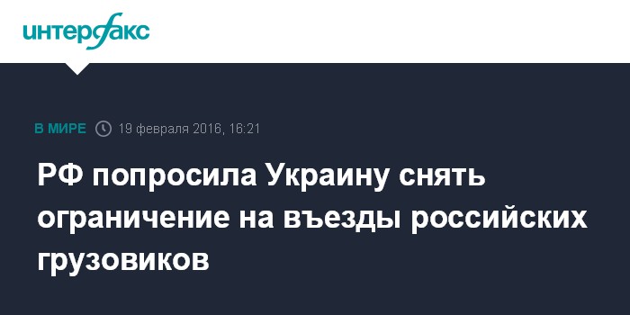 "В рамках достигнутых ранее договоренностей между Россией и Украиной по возврату российских и украинских грузовых транспортных средств, осуществляющих транзитные перевозки, в государства их регистрации (режим "Еду домой"), по состоянию на 15:00 (по Москве) 18 февраля 2016 года блокировка грузовиков с обеих сторон полностью снята. Грузовые автотранспортные средства, у которых срок действия разрешений на транзитные перевозки закончился в 2015 г. и был продлен до 25 февраля 2016 г., отпущены в направлении стран их регистрации", - говорилось в сообщении ведомства.