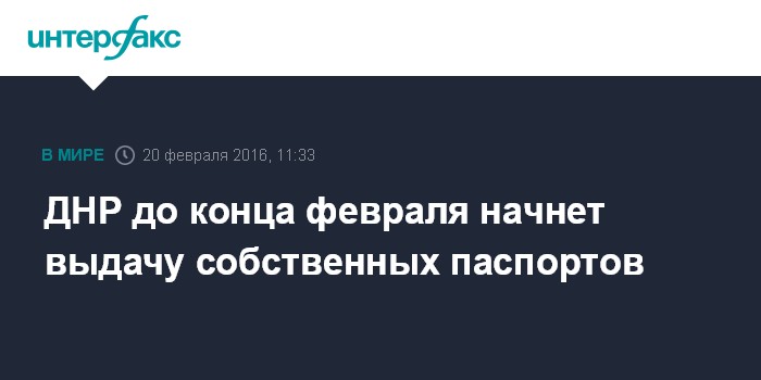 Москва. 20 февраля. INTERFAX.RU - Глава самопровозглашенной Донецкой народной республики Александр Захарченко сообщил, что пробная партия паспортов ДНР уже напечатана и первый документ будет выдан до конца февраля.