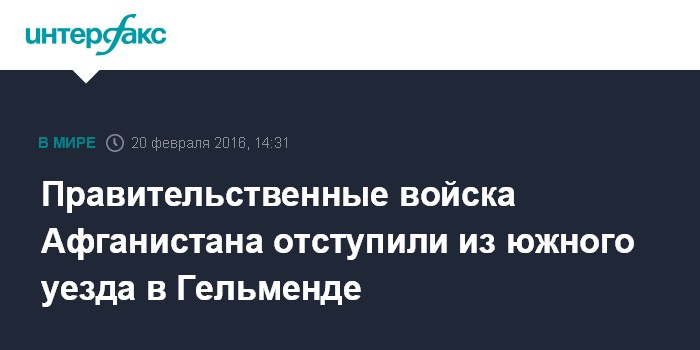 Москва. 20 февраля. INTERFAX.RU - Правительственные войска после нескольких месяцев тяжелых боев оставили боевикам экстремистского движения Талибан уезд на юге Афганистана, в Гельменде.