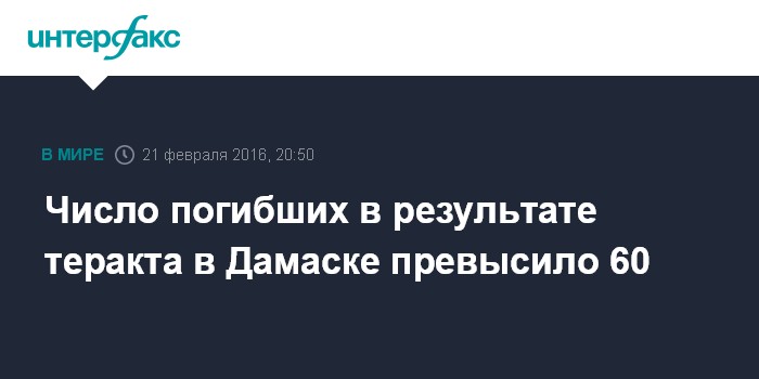 Москва. 21 февраля. INTERFAX.RU - Число погибших в результате серии взрывов в Дамаске достигло 62 человек, десятки человек получили ранения. Об этом сообщил Наблюдательный совет по правам человека в Сирии.