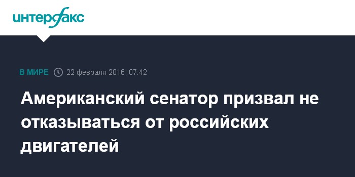 Москва. 22 февраля. INTERFAX.RU - Сенатор Конгресса США от штата Алабама, республиканец Ричард Шелби призвал не отказываться от закупки российских ракетных двигателей РД-180 до тех пор, пока не появится достойная американская замена. Он выступил со статьей в газете The Wall Street Journal с критикой предложение сенатора Джона Маккейна, который считает покупку двигателей "подарком Путину".