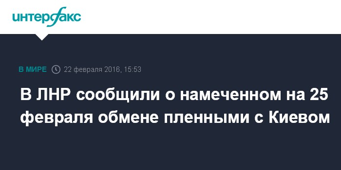 Москва. 22 февраля. INTERFAX.RU - Обмен военнопленными между ополченцами самопровозглашенной Луганской народной республики и украинскими военными запланирован на 25 февраля, сообщила руководитель рабочей подгруппы ЛНР по обмену пленными Ольга Кобцева.