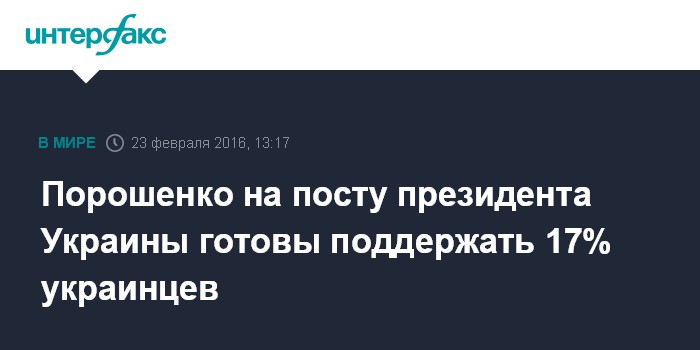 Москва. 23 февраля. INTERFAX.RU - Если бы президентские выборы проходили в ближайшее воскресенье, то действующего президента Украины Петра Порошенко поддержали бы 17,2% избирателей Украины, свидетельствуют результаты социологического исследования, которое было проведено Институтом Горшенина "Общественное и политическое настроение населения Украины".