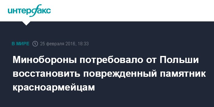 Москва. 25 февраля. INTERFAX.RU -Минобороны РФ выражает обеспокоенность очередным актом вандализма в отношении памятника воинам Советской Армии, совершенным в Польше, заявил журналистам в четверг начальник управления по увековечению памяти погибших при защите Отечества Владимир Попов.
