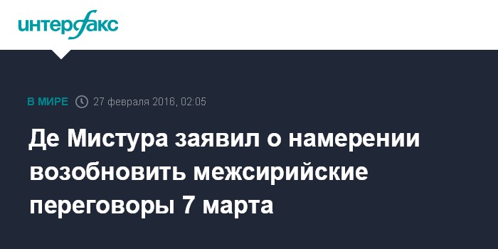 "В случае соблюдения условий прекращения огня и обеспечения поставок гуманитарной помощи я намерен возобновить межсирийские переговоры 7 марта", - сказал С.де Мистура.