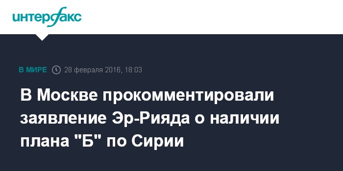 Москва. 28 февраля. INTERFAX.RU - Заявления из Эр-Рияда о якобы существовании плана "Б" на случай провала перемирия в Сирии, исключающего президента Башара Асада, противоречат всем решениям СБ ООН, в том числе последней резолюции, принятой единодушно, считают в Москве.