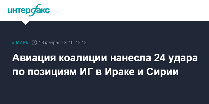 Москва. 28 февраля. INTERFAX.RU - Руководимая США международная коалиция против "Исламского государства" (ИГ, группировка запрещена в России - ИФ) в субботу нанесла 24 авиаудара по позициям исламистов в Сирии и Ираке, сообщило командование коалиции.