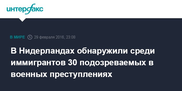 Москва. 29 февраля. INTERFAX.RU - Власти Нидерландов идентифицировали 30 человек, подозреваемых в военных преступлениях, среди иммигрантов, запросивших убежище в королевстве в 2015 году, говорится в письме министерства юстиции Нидерландов, составленном в ответ на запрос нидерландских депутатов.