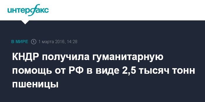 Москва. 1 марта. INTERFAX.RU - Россия поставила во вторник в КНДР 2,5 тысячи тонн пшеницы по линии Всемирной продовольственной программы (ВПП) ООН, сообщает посольство России в Пхеньяне.