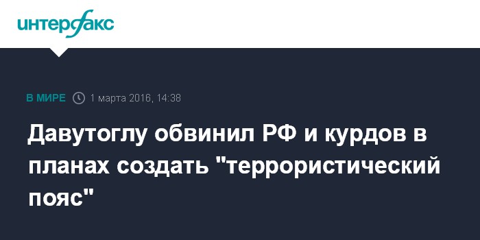 Москва. 1 марта. INTERFAX.RU - Турецкий премьер-министр Ахмет Давутоглу обвинил Россию в намерении вместе с курдами создать у южных границ Турции некий "террористический пояс".
