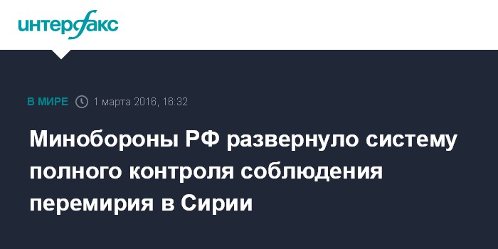 Москва. 1 марта. INTERFAX.RU - Для усиления контроля за режимом прекращения боевых действий на территории Сирии Вооруженными силами РФ создана система, позволяющая полностью отслеживать ситуацию в зоне конфликта, сообщает Управление пресс-службы и информации Минобороны России.