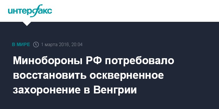 "Нас беспокоит, что это уже второй акт вандализма, совершенный в феврале в области Фейер. Напомню, что в прошлом году было совершено 6 актов вандализма в отношении российских воинских захоронений на всей территории Венгрии, два из которых произошли также в области Фейер", - заявил во вторник начальник управления Минобороны России по увековечению памяти погибших при защите Отечества Владимир Попов.