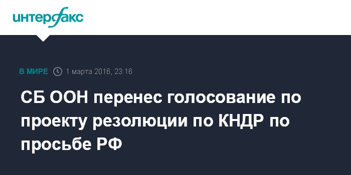 Москва. 1 марта. INTERFAX.RU - Голосование по резолюции, в которой может пойти речь об усилении санкций в отношении КНДР, перенесено со вторника на среду по просьбе России, сообщил на брифинге во вторник представитель госдепа Джон Кирби.