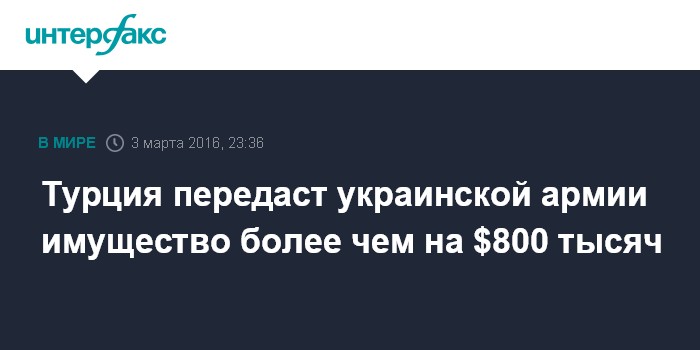Москва. 3 марта. INTERFAX.RU - Кабинет министров Украины одобрил проект соглашения с правительством Турции о безвозмездной передаче обмундирования Вооруженным силам Украины на общую сумму $809 тысяч 730,11.