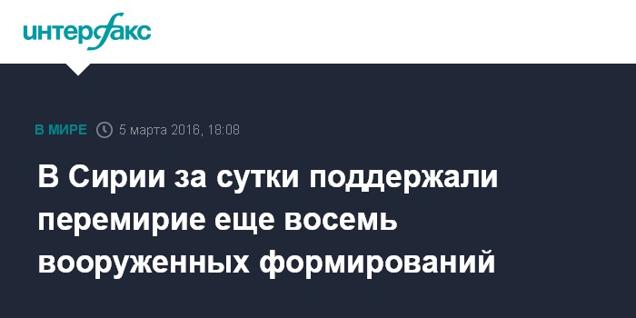 Москва. 5 марта. INTERFAX.RU - В течение прошедших суток получены заявочные листы о присоединении к режиму прекращения боевых действий от восьми командиров вооруженных формирований, действующих в провинции Деръа, говорится в информационном бюллетене Центра по примирению враждующих сторон в Сирии.