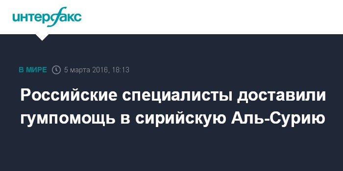 Москва. 5 марта. INTERFAX.RU - Российский Центр по примирению враждующих сторон на территории Сирии доставил 3,5 тонны гуманитарной помощи в населенный пункт Аль-Сурия в провинции Латакия.