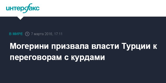Москва. 7 марта. INTERFAX.RU - Верховный представитель ЕС по иностранным делам Федерика Могерини заявила о необходимости для Турции перезапустить процесс мирных переговоров с курдами.