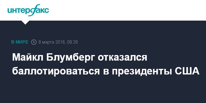 Москва. 8 марта. INTERFAX.RU - Бывший мэр Нью-Йорка миллиардер Майкл Блумберг отказался от участия в президентских выборах 2016 года в США, сообщает Bloomberg View.