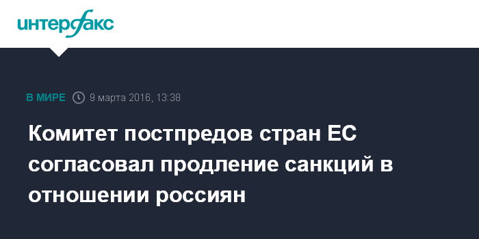 Москва. 9 марта. INTERFAX.RU - Комитет постоянных представителей стран ЕС (COREPER) договорился в среду о продлении на шесть месяцев ограничительных мер в отношении российских и украинских граждан и организаций которых в ЕС считают причастными к подрыву или угрозе территориальной целостности Украины. Это подтвердил "Интерфаксу" европейский дипломатический источник.
