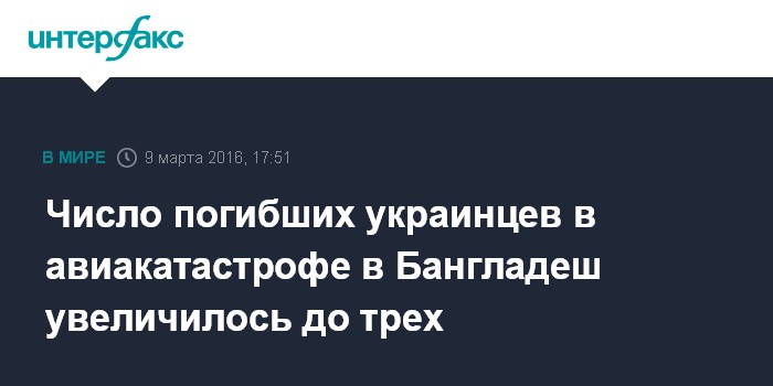 Москва. 9 марта. INTERFAX.RU - В авиакатастрофе в Бангладеш погибли трое украинцев, еще один находится в критическом состоянии в больнице, сообщил первый секретарь департамента консульской службы МИД Украины Евгений Игнатовский