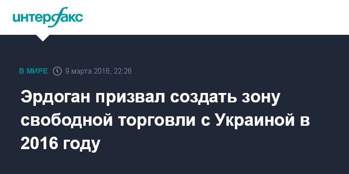 Москва. 9 марта. INTERFAX.RU - Украина и Турция должны завершить в 2016 году переговоры по созданию зоны свободной торговли между двумя государствами и заключить договор, заявил президент Турецкой Республики Реджеп Тайип Эрдоган.