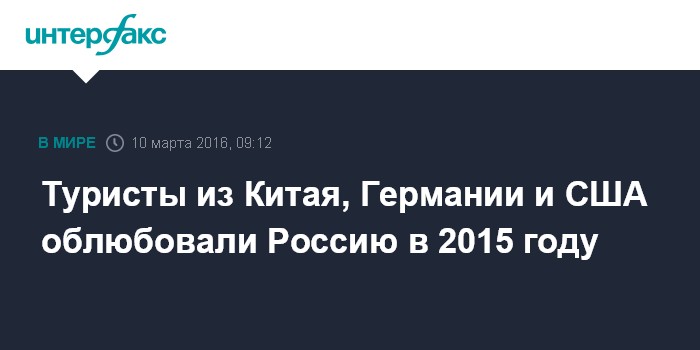 Москва. 10 марта. INTERFAX.RU - Въездной туристический поток в Россию в минувшем году вырос на 13,7% по сравнению с 2014 годом, до 2,93 млн поездок, лидерами по числу туристов стали Китай, Германия и США, сообщила порталу "Интерфакс-Туризм" в четверг пресс-секретарь Российского союза туриндустрии (РСТ) Ирина Тюрина со ссылкой на данные Росстата.