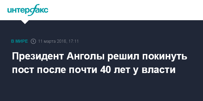 Москва. 11 марта. INTERFAX.RU - Президент Анголы Жозе Эдуарду душ Сантуш объявил о решении уйти из политики по истечении своего срока полномочий, сообщают в пятницу западные СМИ.