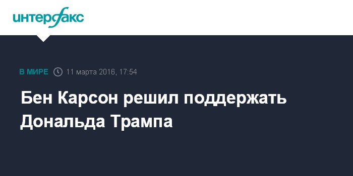 Москва. 11 марта. INTERFAX.RU -Экс-участник предвыборной президентской гонки республиканец Бен Карсон заявил о своей поддержке Дональда Трампа, который продолжает борьбу за выдвижение кандидатом в президенты США от республиканской партии, сообщает "Би-би-си".