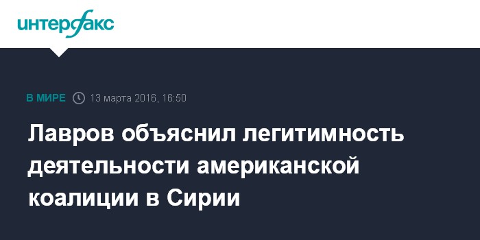 Москва. 13 марта. INTERFAX.RU - Взаимодействие РФ и США по Сирии устранило имевшиеся вопросы о легитимности действий американской коалиции в этой арабской стране, заявил глава МИД РФ Сергей Лавров.