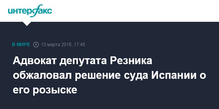Москва. 13 марта. INTERFAX.RU - Защита депутата Госдумы от "Единой России" Владислава Резника обжаловала действия испанского суда, объявившего его в международный розыск и направившего запрос в Интерпол для розыска парламентария по линии международной полиции, сообщил его адвокат Александр Гофштейн.