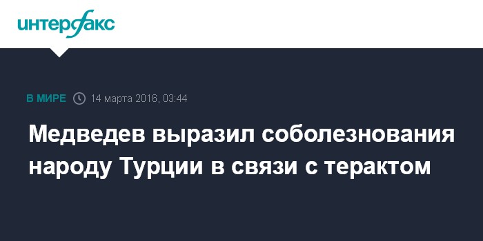 Москва. 14 марта. INTERFAX.RU - Премьер-министр РФ Дмитрий Медведев выразил соболезнования народу Турции в связи с многочисленными жертвами в результате теракта в Анкаре, подчеркнув, что таким преступлениям не может быть оправдания, сообщила пресс-секретарь главы правительства Наталья Тимакова.