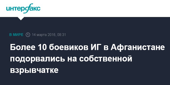Москва. 14 марта. INTERFAX.RU - На востоке Афганистана боевики террористической организации "Исламское государство" (запрещена в России) подорвались на собственной взрывчатке.