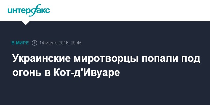 Москва. 14 марта. INTERFAX.RU - Группа украинских миротворцев из состава полицейской миссии ООН в Кот-д'Ивуаре попала под огонь, который открыли накануне неизвестные лица по туристам на пляже курортного города Гранд Бассам (Республика Кот-д'Ивуар), сообщил МИД Украины.